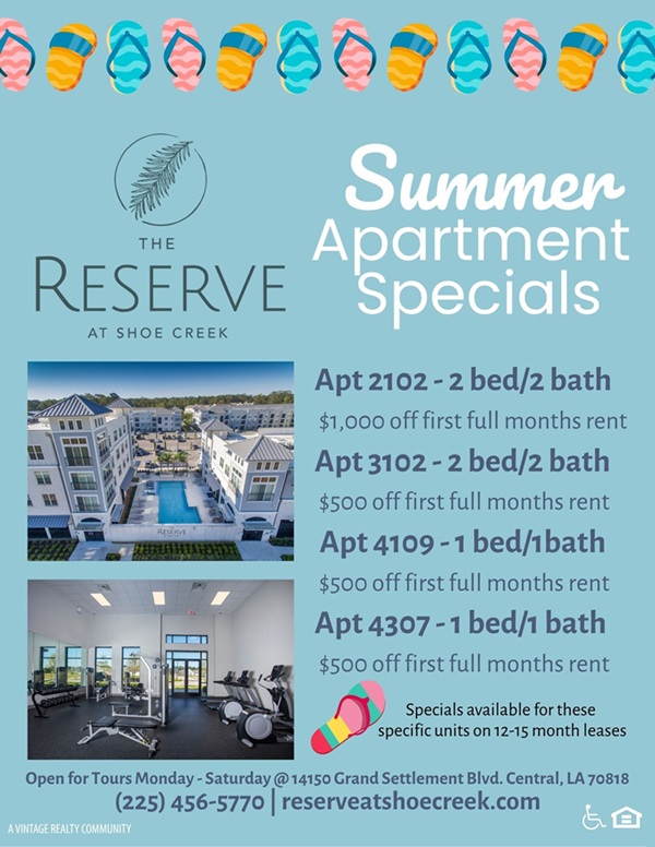 We know it can be difficult finding an apartment to rent that meets all of your needs – but we have everything you could ever want. With spacious floor plans and designer finishes throughout our luxurious apartments in Central, Louisiana we guarantee an apartment you'd love to call home. Schedule an appointment today for your personalized tour of The Reserve at Shoe Creek Luxury Apartments.